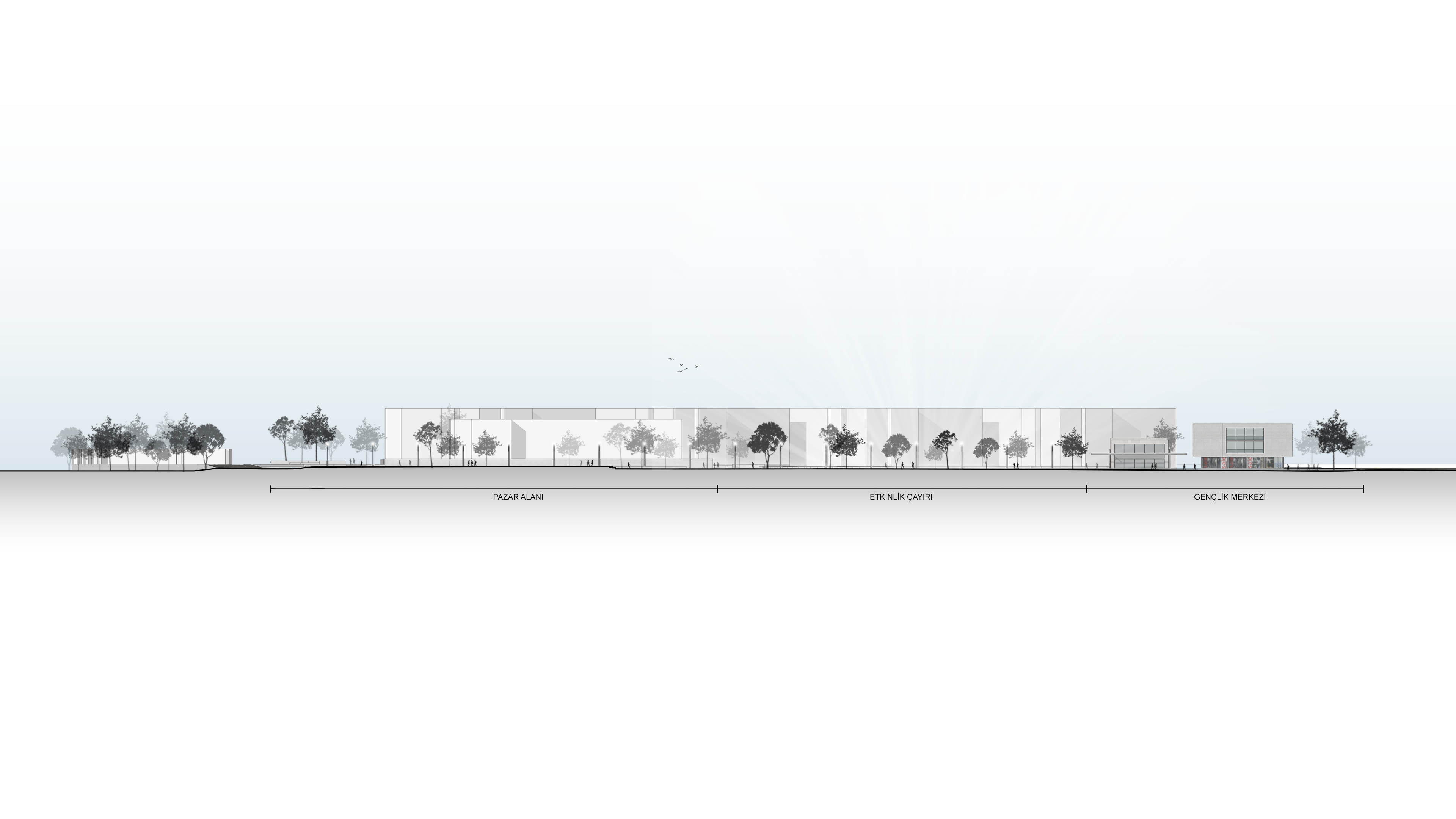 Within this framework, the youth center, comprised of sports fields, a dormitory, and food and beverage facilities for the young population, will be located in the northwest corner of the campus. The Youth Center and its own streets are intended to serve as an interface connecting with the city. To the northeast of the campus, units such as the neighborhood headman's office, a library, and a city memory museum will be located to meet the needs of the city's residents, ensuring continuity along the street to which the Youth Center fronts. An urban meadow is planned for open-air events such as concerts and other events on the campus's western perimeter. A new layout is proposed for the marketplace, already used by residents, just south of the campus.