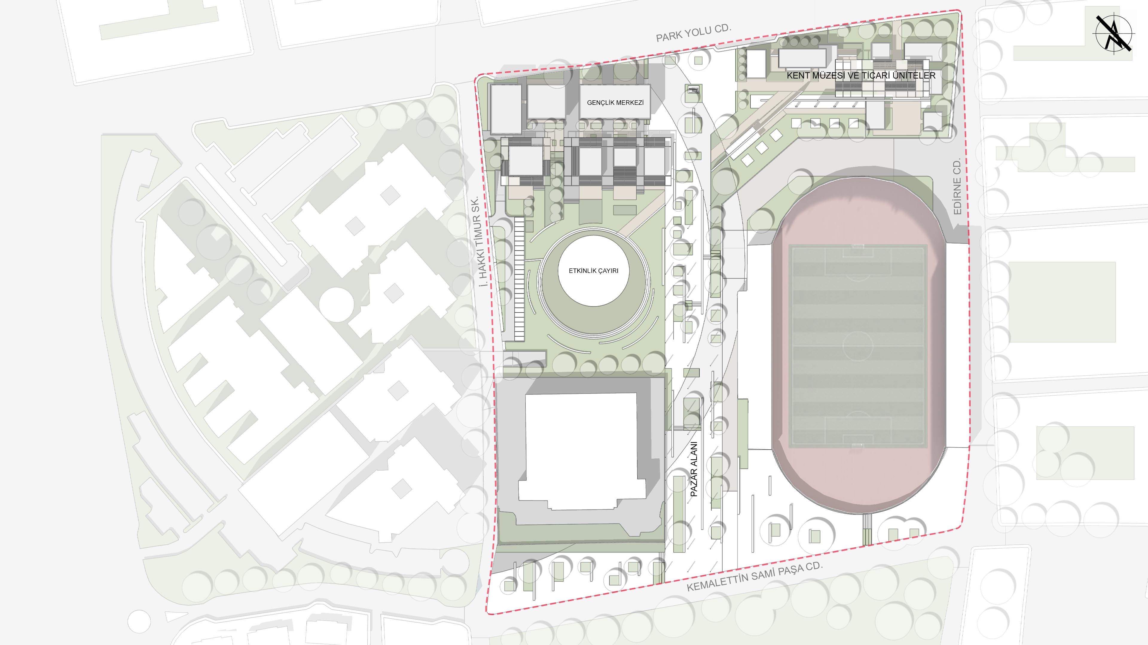 Developed to address the current needs of the stadium, which has been left in İnegöl's city center due to the city's growth, the adjacent marketplace, and its surrounding area, the project aims to create a new focal point for the city with units such as an open event area, commercial units, a parking lot, and an indoor marketplace.