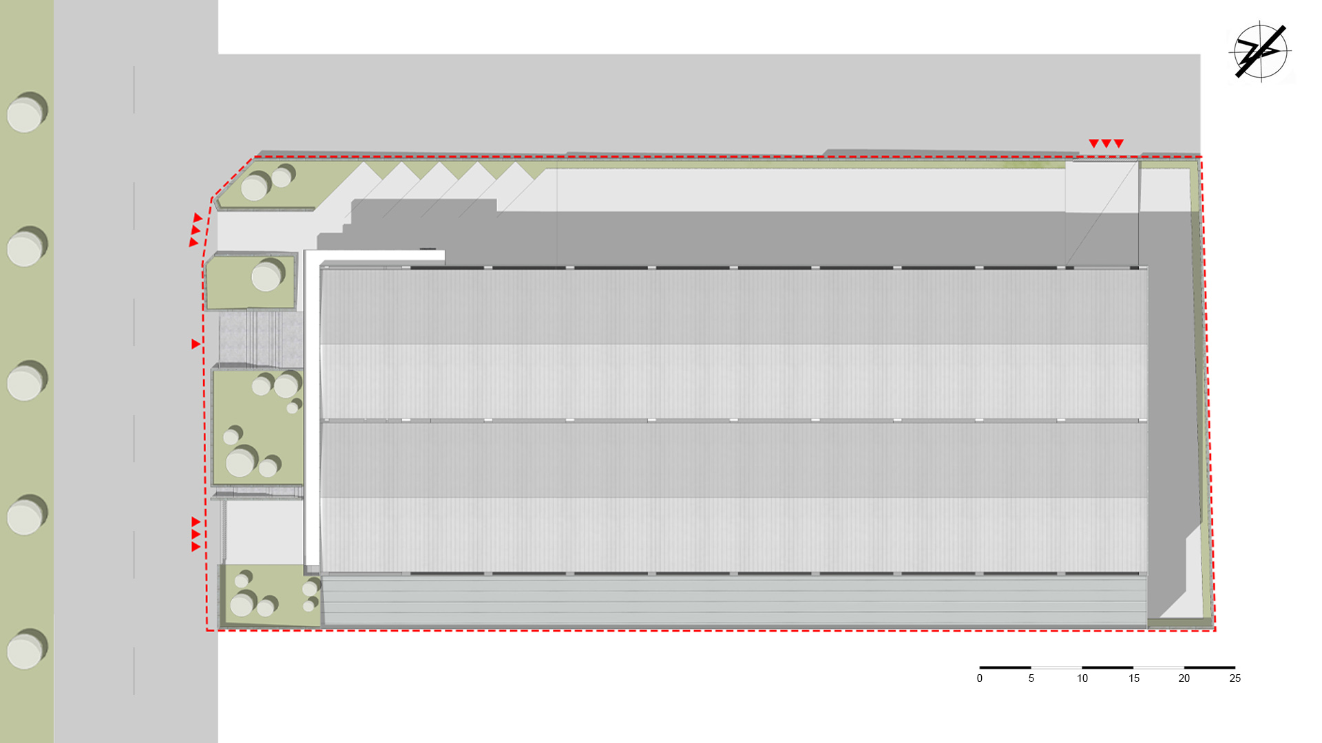 REN-KA MAKİNE Başköy Factory and Administrative Building were designed with metalworking production data in mind for the detached industrial parcel. The production building serves a production scenario based on the input of raw materials into the building and the separation of manufactured products. Due to the parcel's location, a second wall on the administrative building's south-facing facade provides solar control. The landscaping in front of the cafeteria aims to provide users with a connection to the greenery during breaks.