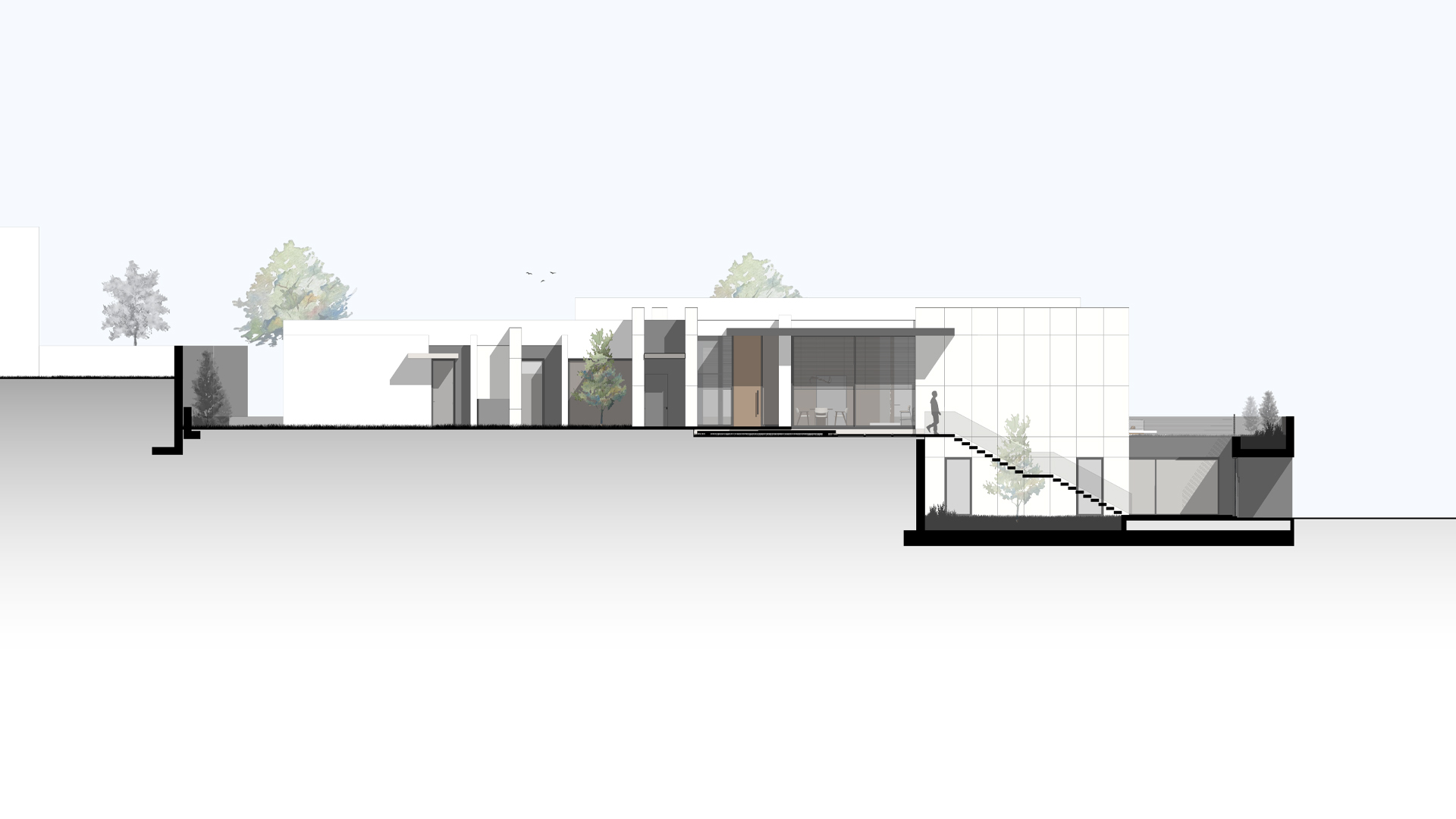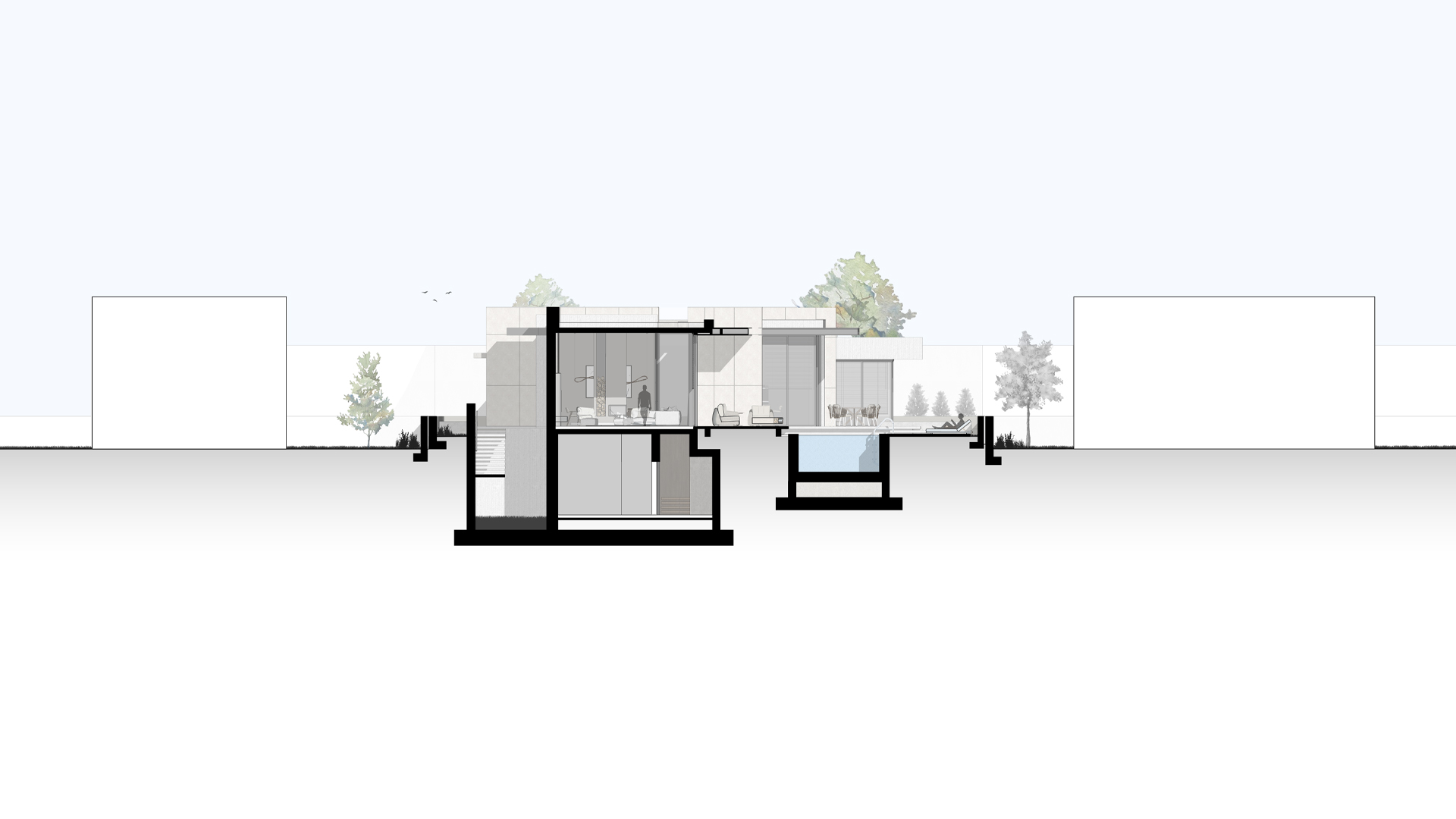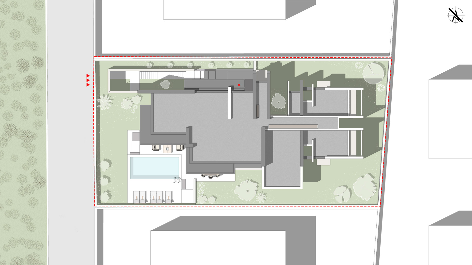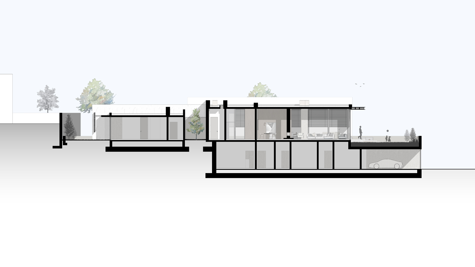 Spaces such as parking and technical spaces are planned underground, while a large garden area is left to the south.